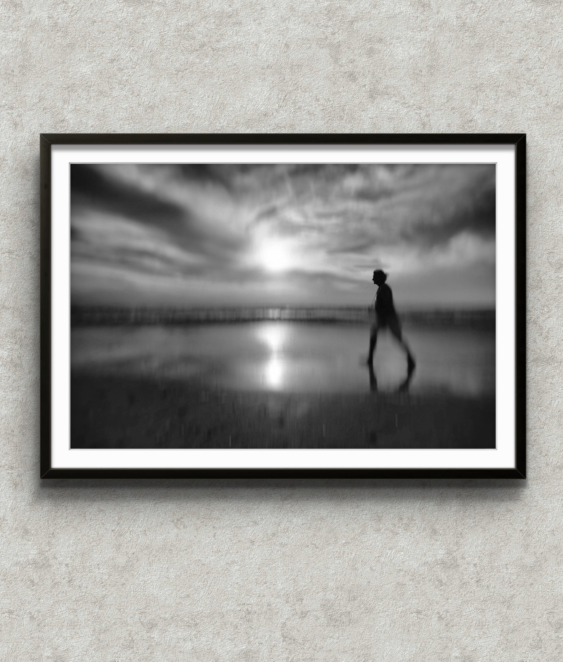 Description: This black and white fine art photograph captures a silhouetted figure jogging along the beach at sunset, immersed in a soft, atmospheric blur. The lens effect creates a dreamlike sense of motion and solitude, turning a fleeting moment into a timeless visual story. A thoughtful piece for those who appreciate mood, movement, and minimalist storytelling.