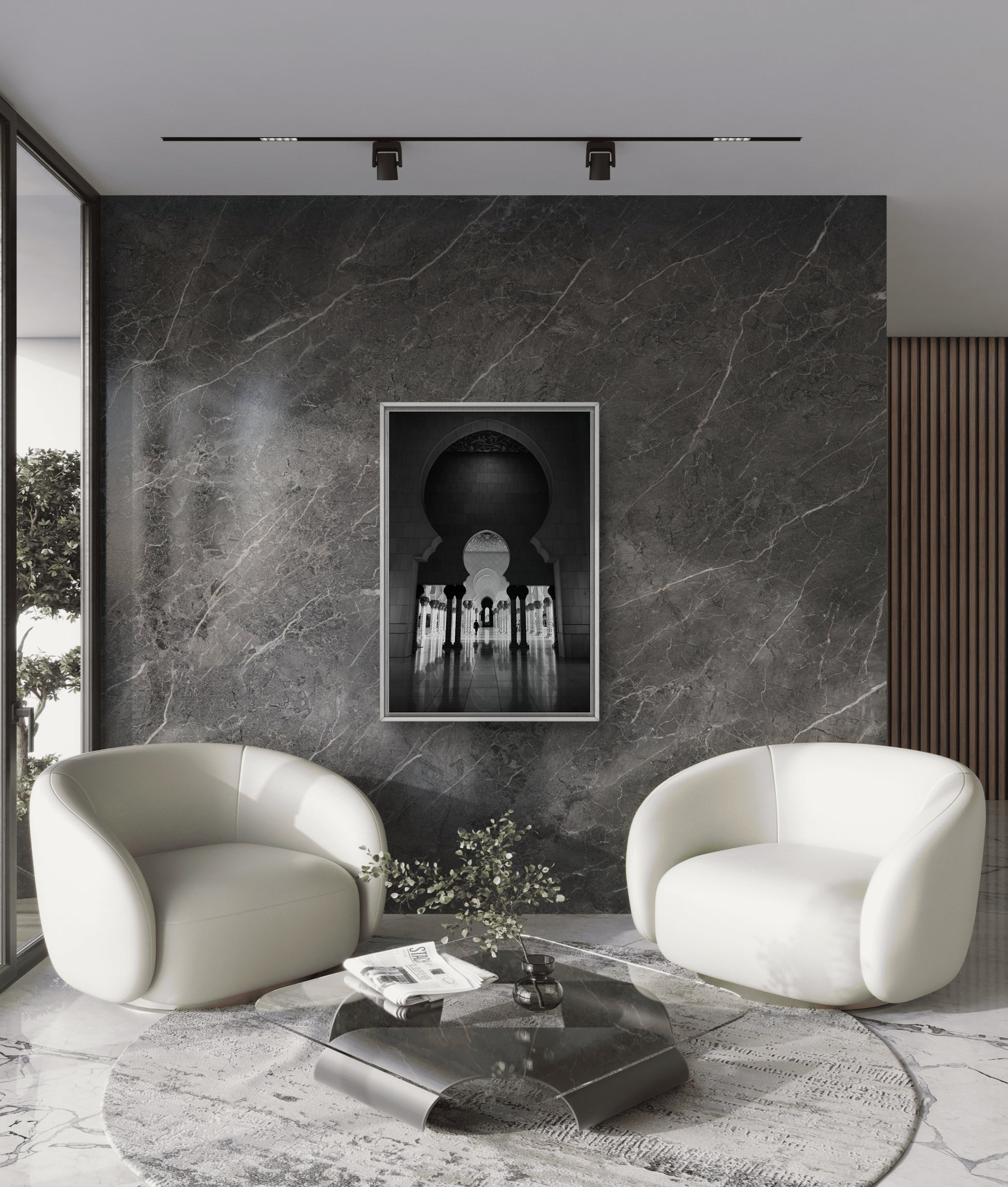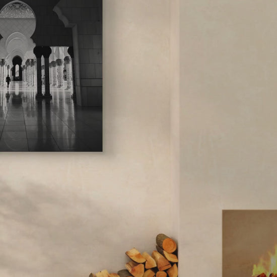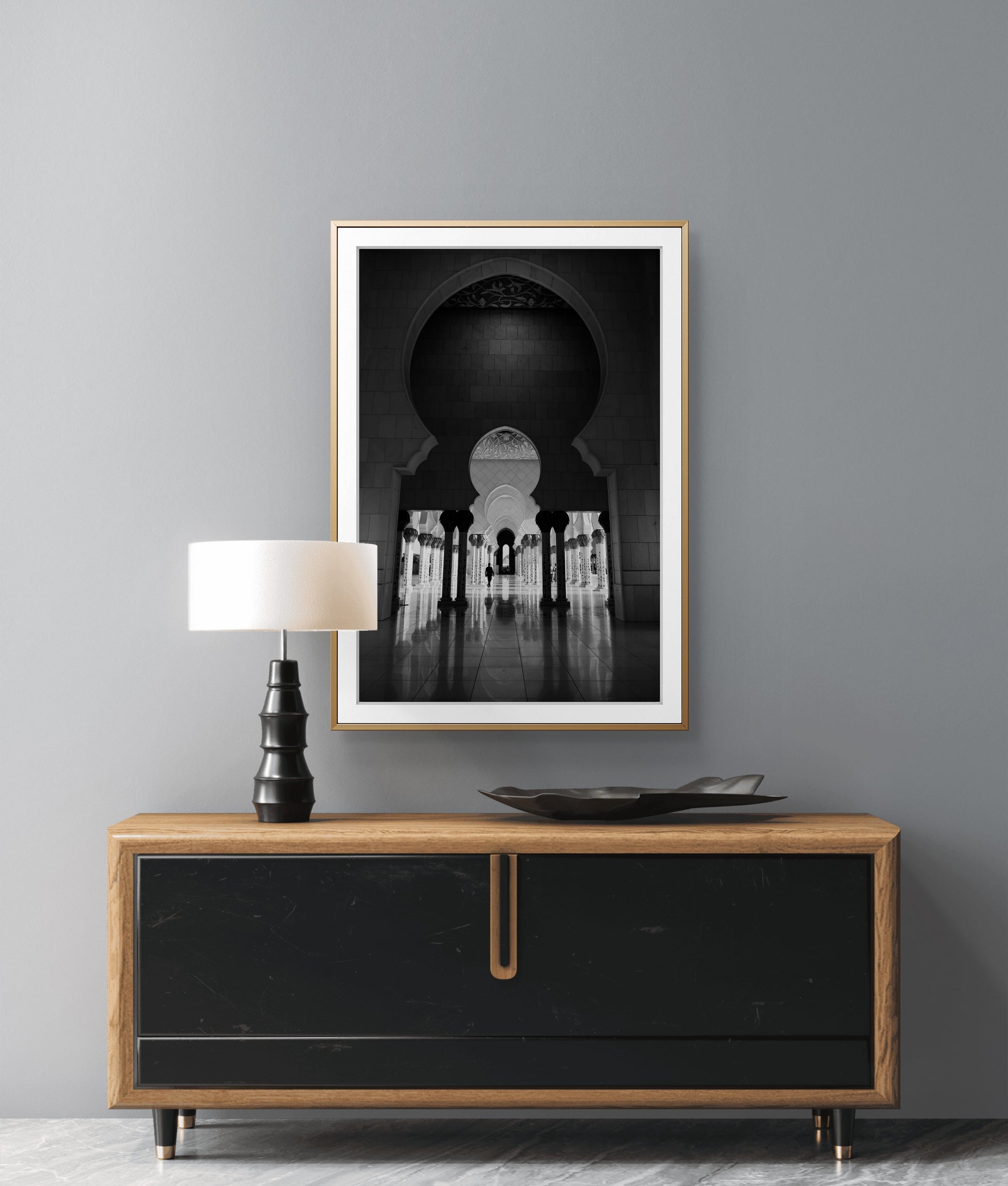 Description: This black and white fine art photograph highlights the graceful symmetry and architectural elegance of the Grand Mosque’s arches. The composition draws attention to light, shadow, and structure, offering a timeless perspective on sacred space. A contemplative piece for lovers of architectural beauty and spiritual calm.