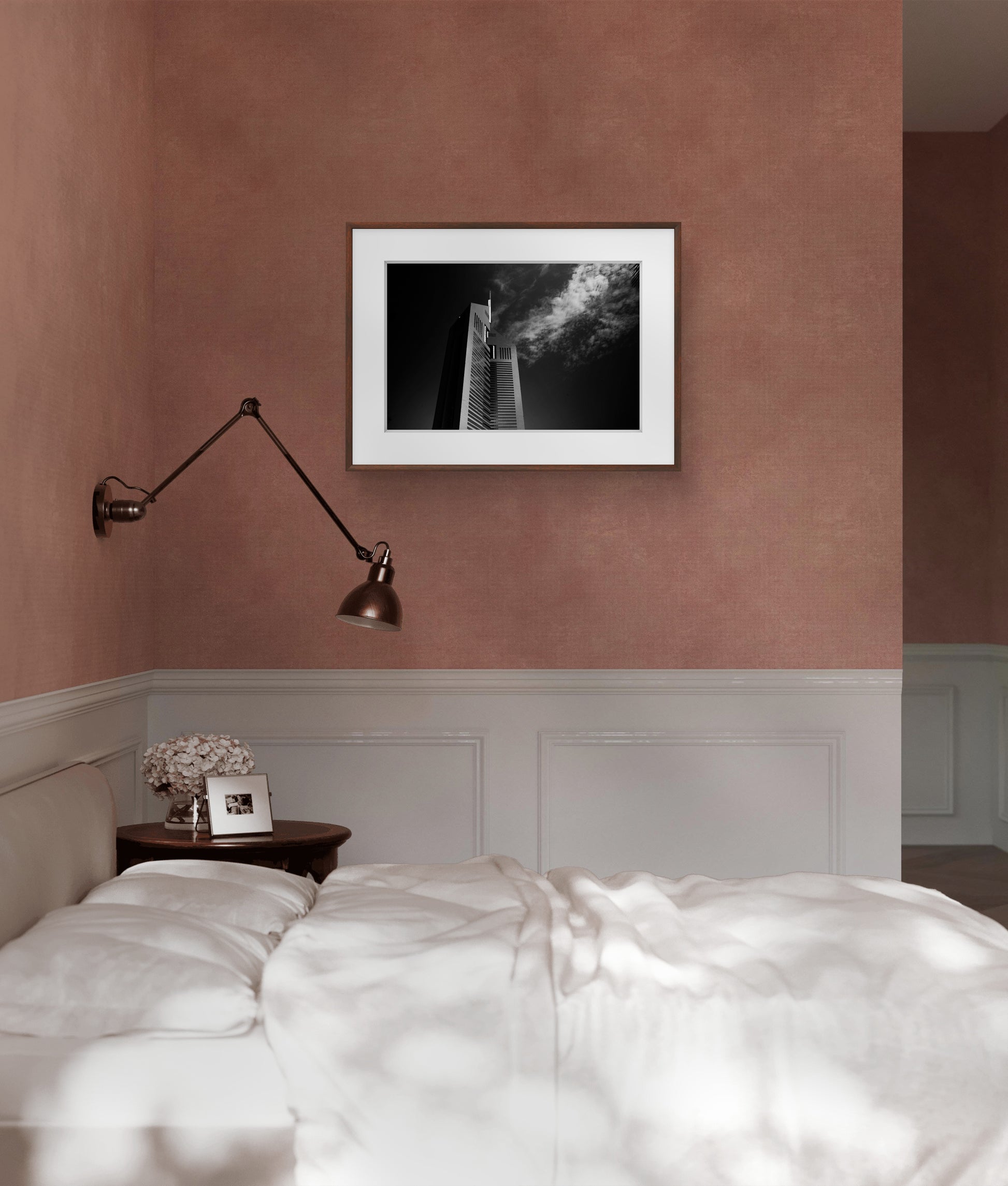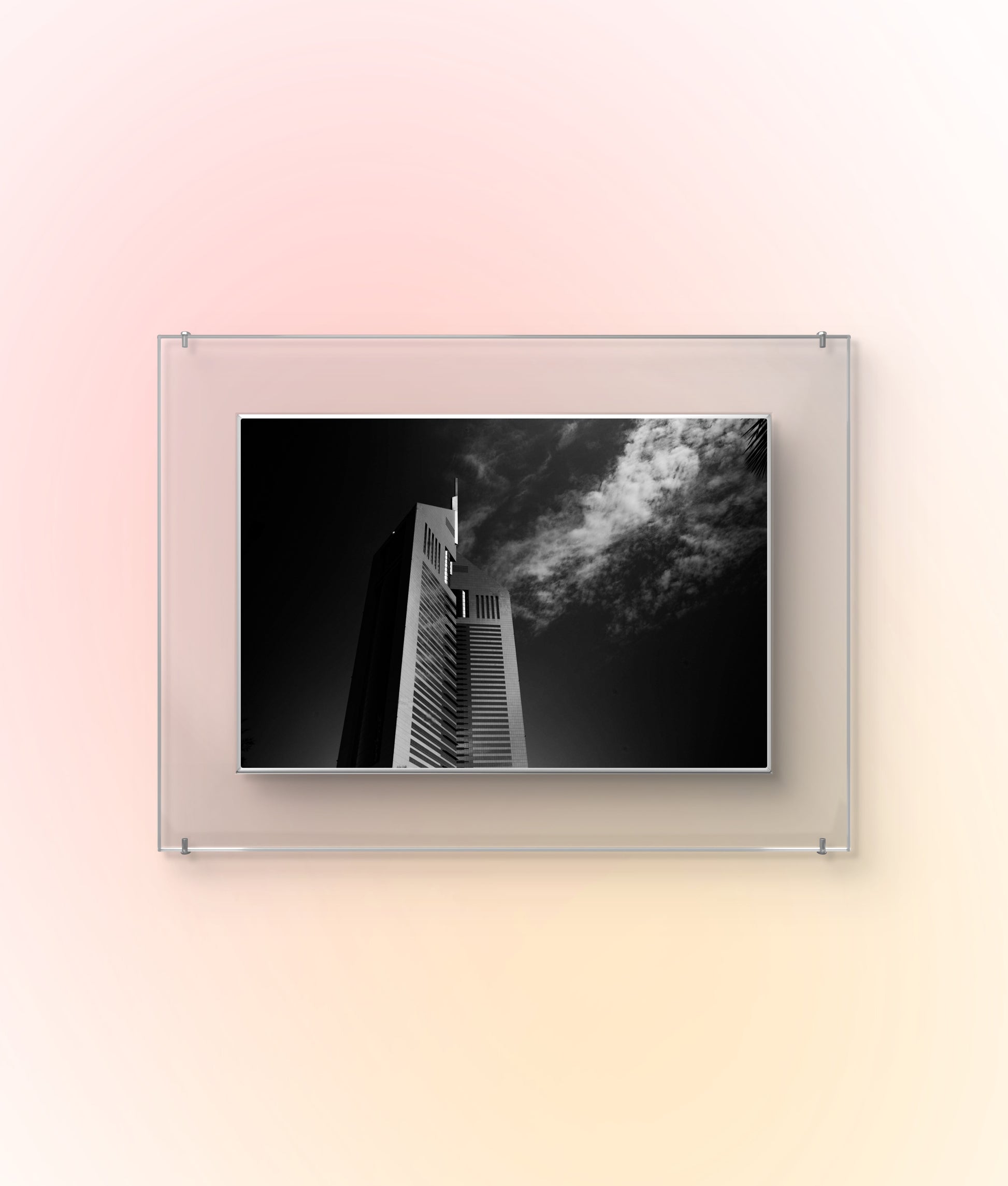 Description: This striking black and white fine art photograph captures the iconic Emirates Towers reaching into a sky softened by drifting clouds. The minimalist composition and rich tonal contrast create a sense of calm strength and architectural grace. Ideal for modern interiors, this piece brings a timeless, elevated atmosphere to any space.