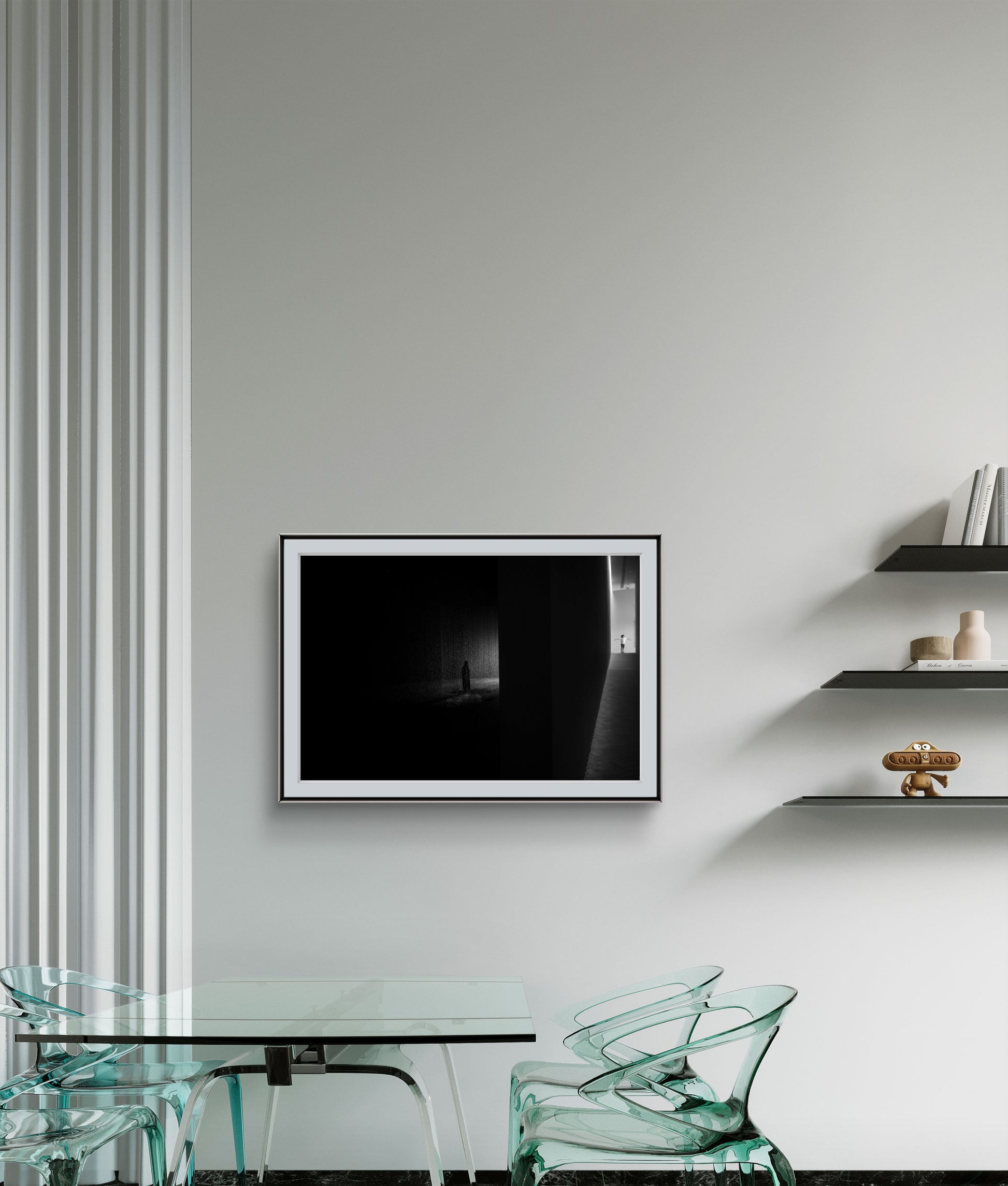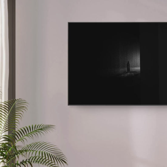 Description: This atmospheric black and white photograph captures a moment of stillness within Sharjah’s Rain Room installation. With its dramatic interplay of shadow, light, and falling water, the image evokes a sense of quiet introspection. A striking piece for those drawn to conceptual spaces, contemporary art, and minimalist depth.