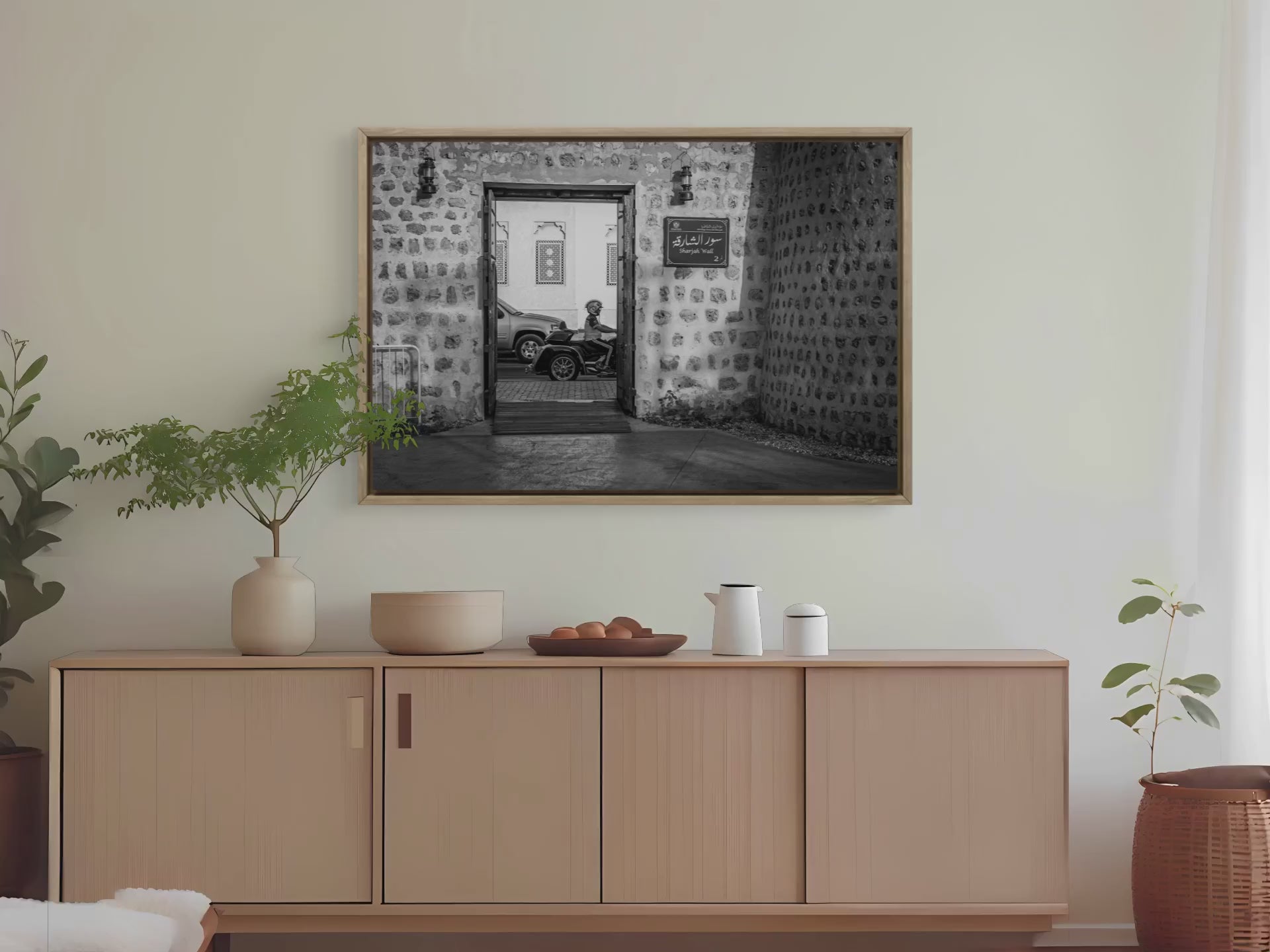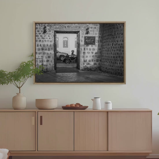 Description: This black and white fine art photograph captures a candid moment as a man on a motorcycle rides through the arched doorway of Sharjah’s historic wall, wearing a whimsical helmet that adds a touch of humor to the scene. The contrast between tradition and modern life creates a visually engaging and culturally rich composition, perfect for those who appreciate authentic street moments with personality.