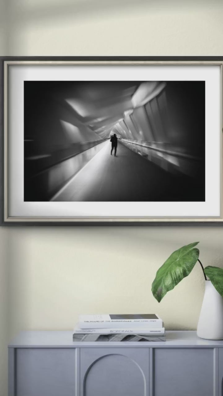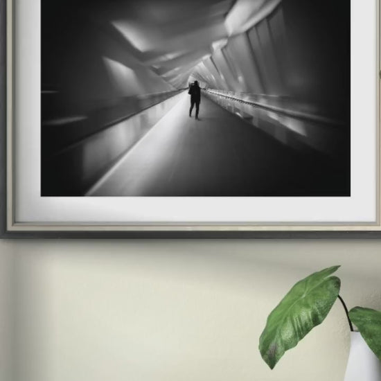 Description: This dynamic black and white fine art photograph features a striking view of a twisted bridge, enhanced by subtle motion blur and a lone approaching figure. The combination of architectural curves and human presence adds depth and narrative tension to the scene, turning a structural element into a visual story. A compelling piece for those drawn to bold composition and emotive street photography.